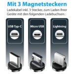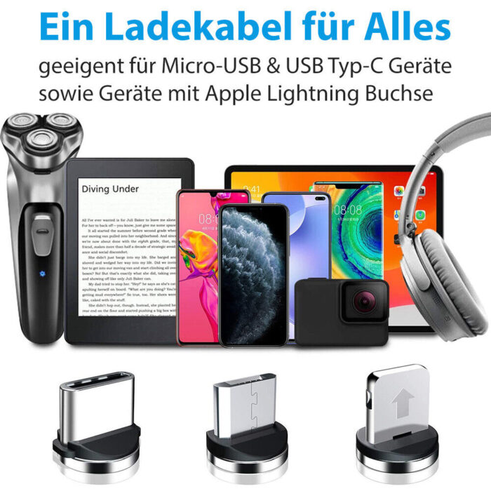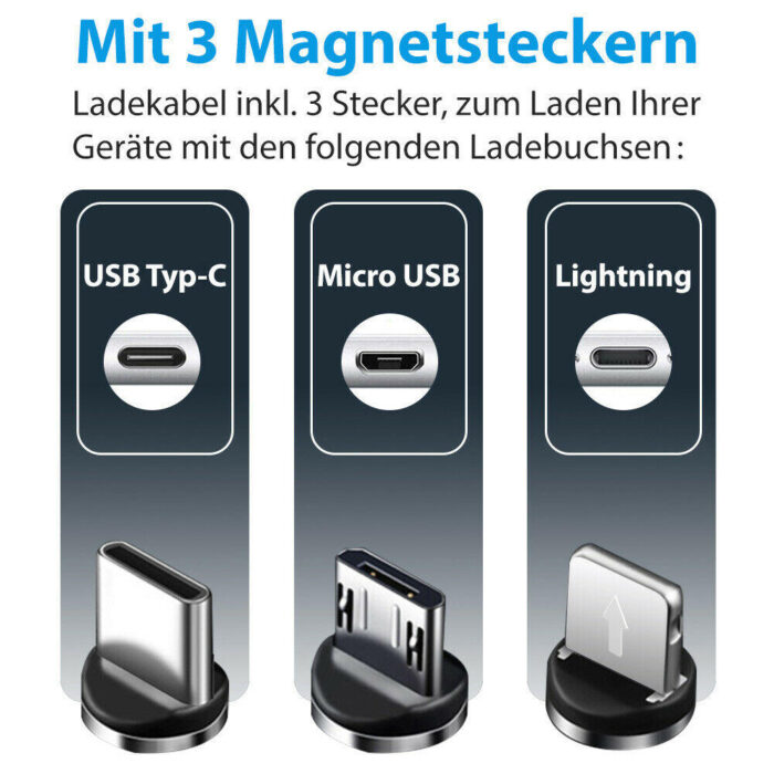 3’ü 1 Arada Manyetik Şarj Kablosu Seti iPhone iPad Samsung USB-C & Lightning 2.4A 100cm Siyah