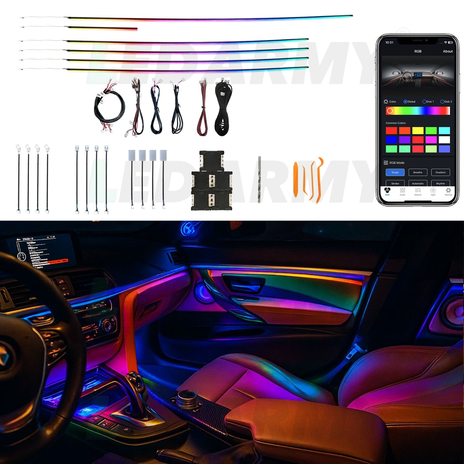 Araç içi ambiyans LED seti RGB 64 renk, Türkiye’de en çok aranan araç içi ambiyans led, araç içi ambiyans aydınlatma seti, rgb araba içi led ışık ve bluetooth ambiyans led gibi aramalara birebir uyumlu profesyonel bir çözümdür.