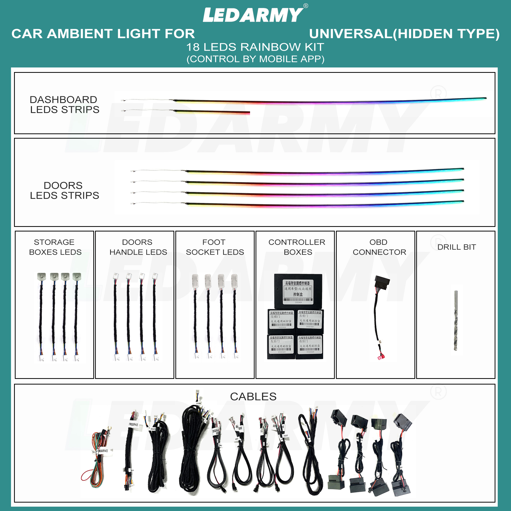Araç içi ambiyans LED seti, RGB 64 renk, bluetooth kontrol ve müzik duyarlı özellikleri ile aracınızı tamamen farklı bir seviyeye taşır.