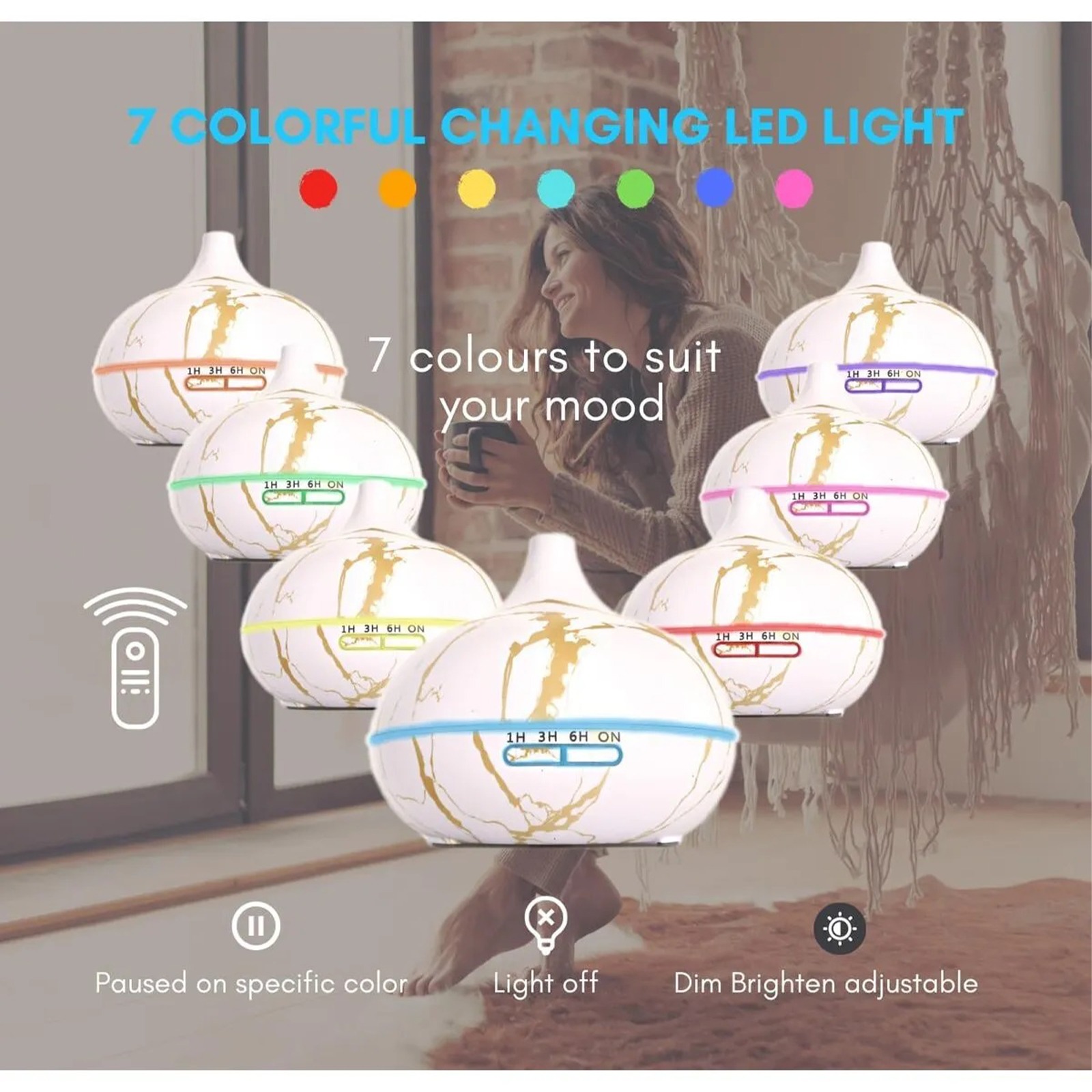 550ml kapasiteli bu aroma terapi difüzör, ahşap görünümlü tasarımı ve 7 renk LED ışıklarıyla odanıza hoş bir ambiyans kazandırır.