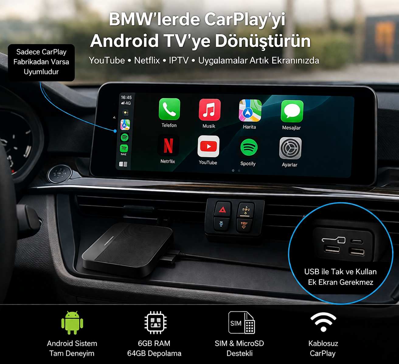 BMW için kablosuz CarPlay AI Box, aracında orijinal CarPlay bulunan kullanıcılar için geliştirilmiş akıllı bir multimedya çözümdür. “BMW CarPlay Android Box satın al”, “CarPlay Netflix nasıl izlenir”, “BMW YouTube izleme cihazı” gibi Türkiye’de en çok aranan ihtiyaçlara direkt çözüm sunar.