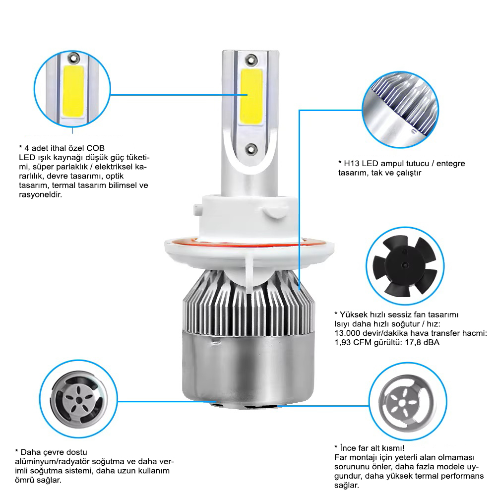 Gelişmiş COB LED çip teknolojisi sayesinde standart halojen ampullere göre %300’e kadar daha fazla ışık verir. Bu da karanlık yollarda daha erken fark etme ve daha güvenli sürüş anlamına gelir.