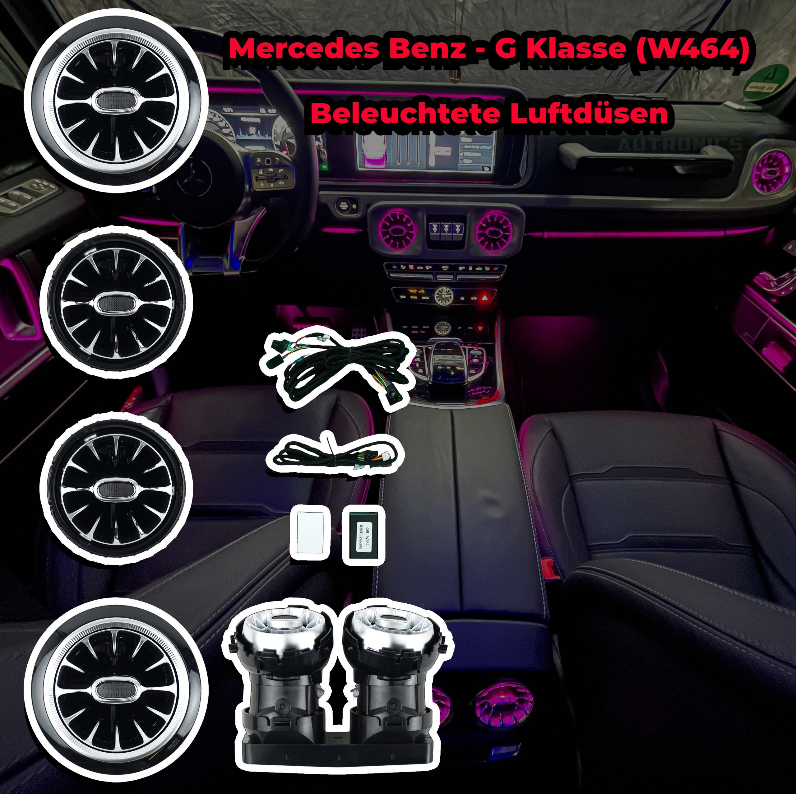 Mercedes-Benz G sınıfı W464 için tasarlanmış ışıklı LED havalandırma türbin nozulları ile aracınıza lüks bir ambiyans katın. Yüksek kaliteli malzemeden üretilen bu LED nozullar, 64 renk seçeneği ile aracınızın iç mekanını kişiselleştirmenize olanak tanır. Kolay montaj, enerji verimliliği ve şık tasarımıyla dikkat çeker.