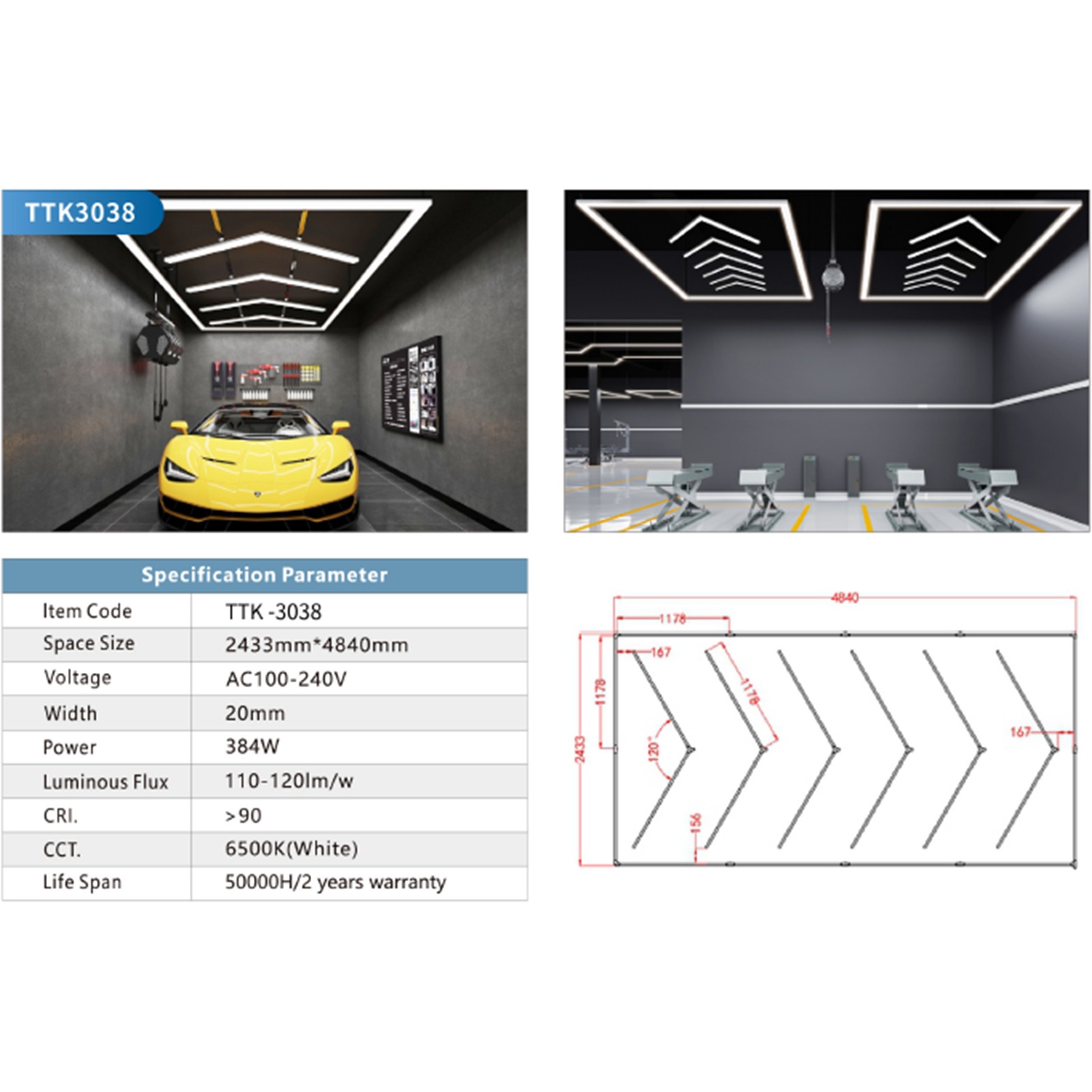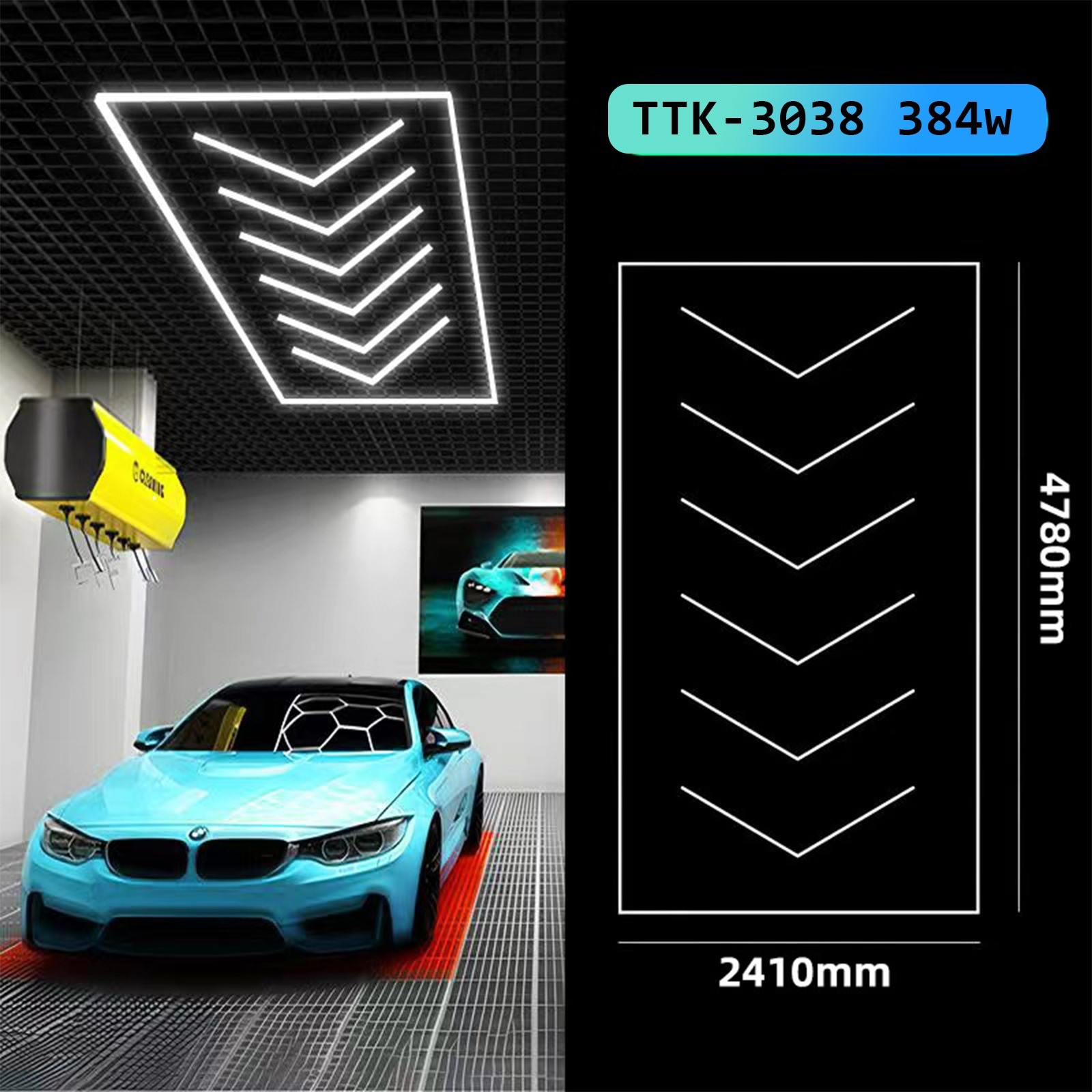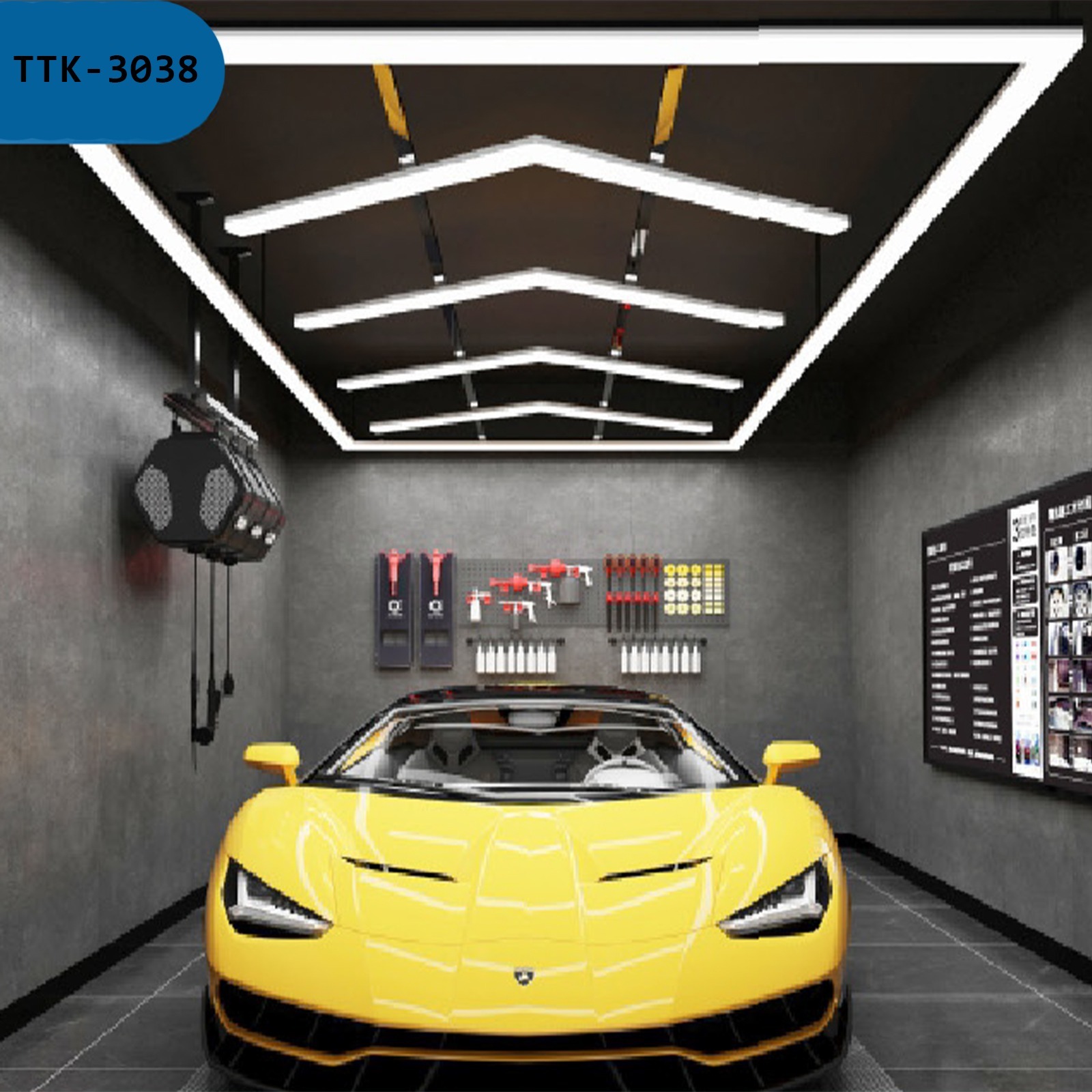 Hexagon (TTK-3038) 384w Tuning Atölye LED aydınlatma tavan ve duvar için. Araç bakım ışıkları, garaj detaylandırma aydınlatma çözümleri