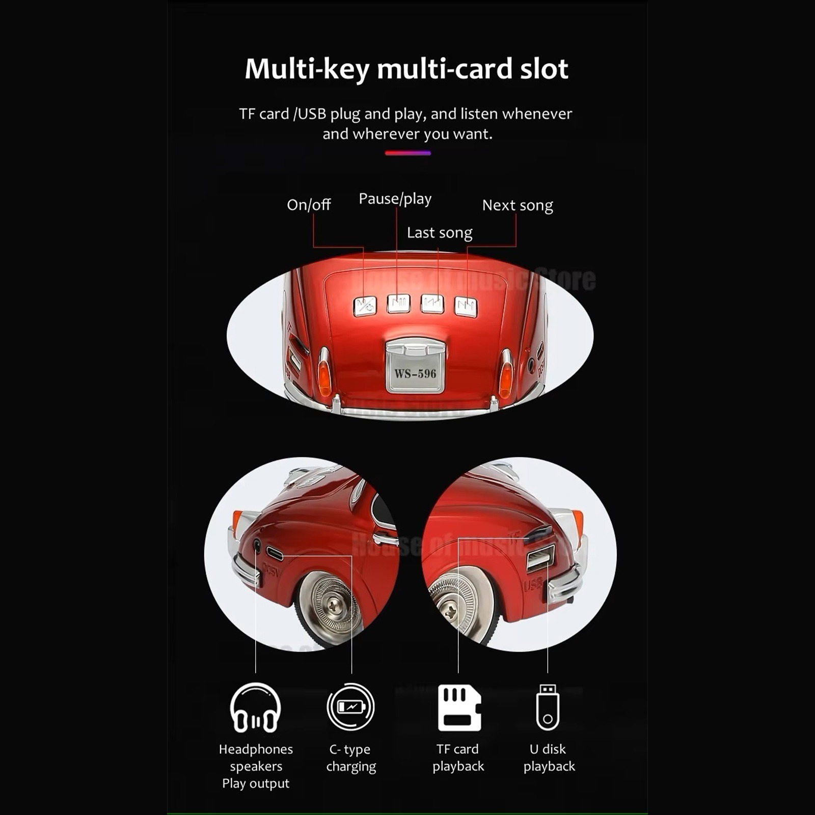 Taşınabilir Bluetooth WS-596 Kablosuz Hoparlör – Klasik Roadster Tasarımı, 10W